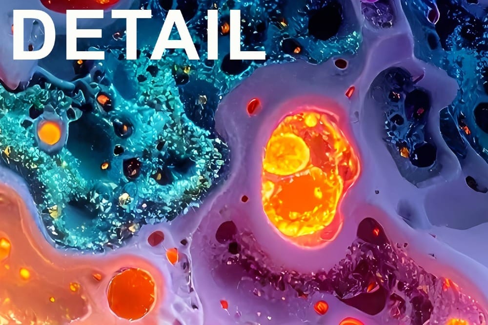 Electric pink, acid green, ultraviolet, cyan, and molten orange flow through deep cracks and cavities, giving the artwork a vibrant sci-fi, tech-inspired look with rich detail and depth.