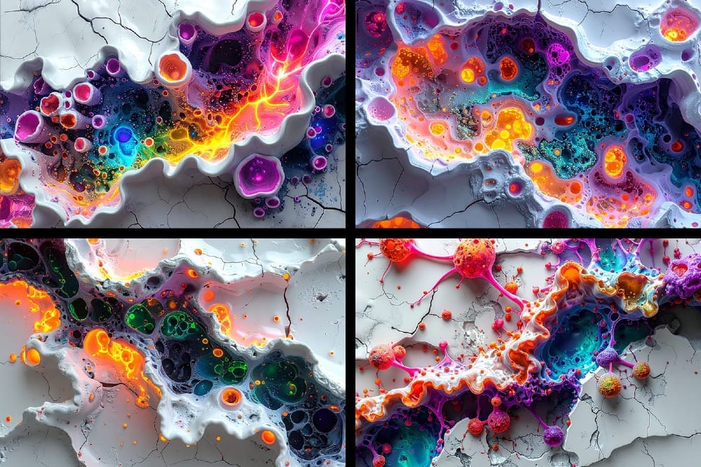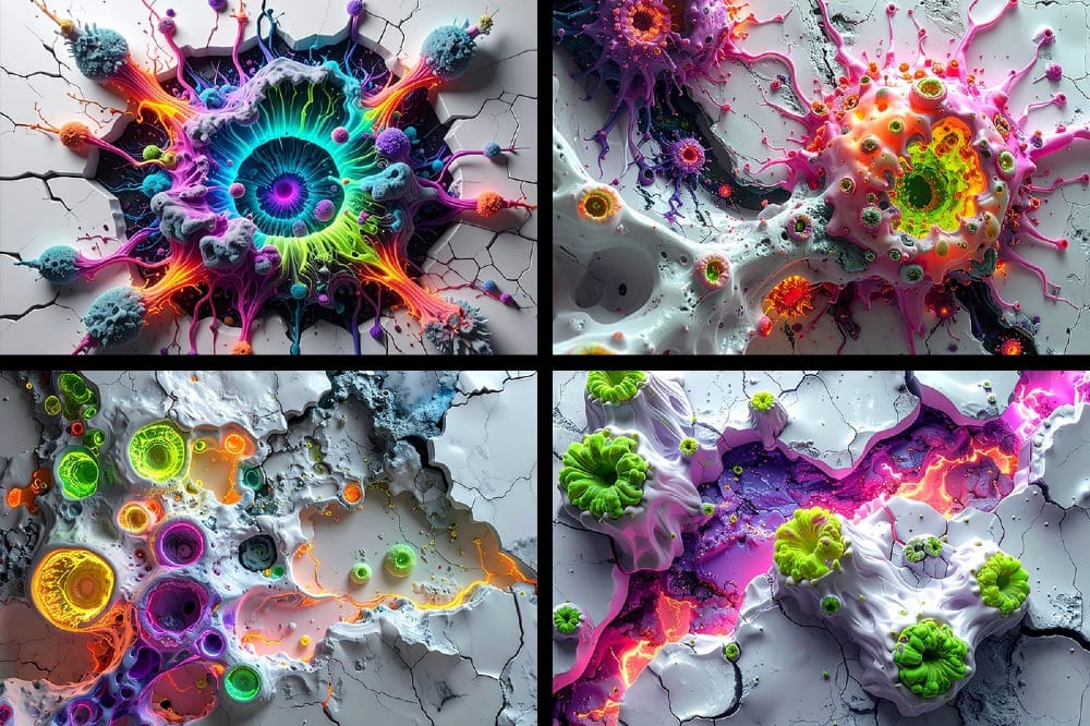 Alien Organics is a collection of 8 free bold, high-contrast abstract neon texture backgrounds inspired by futuristic bio-forms and cracked ceramic surfaces. Each design blends glowing organic growth patterns with fractured matte-white textures, creating a strong contrast between smooth synthetic color and raw broken structure.
