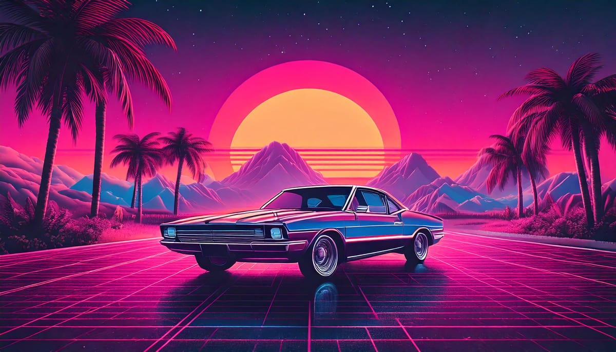 The color palette typically features magenta and cyan gradients reminiscent of early computer graphics and VHS aesthetics. Perspective grids, chrome text effects, and palm trees create a synthetic paradise that feels both futuristic and nostalgic. These elements work together to evoke a sense of digital melancholia and retrofuturistic optimism.