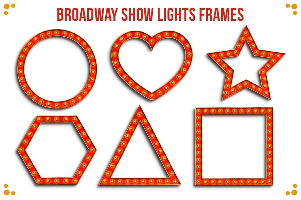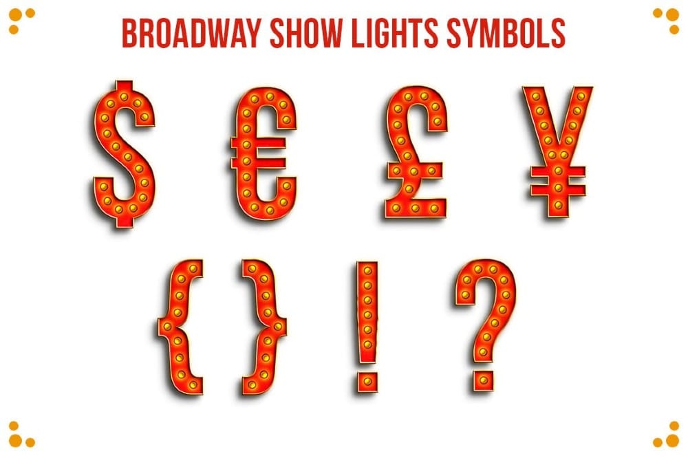 The Broadway Show Lights Alphabet Set is a decorative lettering collection inspired by classic theater and marquee lighting. It includes a full alphabet along with numbers, symbols, punctuation marks, and decorative frames, making it easy to build eye-catching titles and layouts.