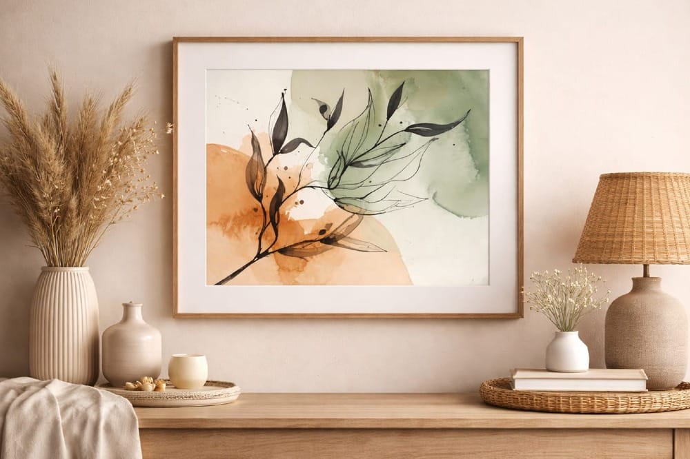 Expressive black ink brush strokes weave through warm earthy color fields of muted greens, clay tones, and soft neutrals. Some artworks also include subtle decorative handwritten scripts that appear faintly within the background texture, adding a quiet sense of depth and artistic character while remaining secondary to the botanical forms.