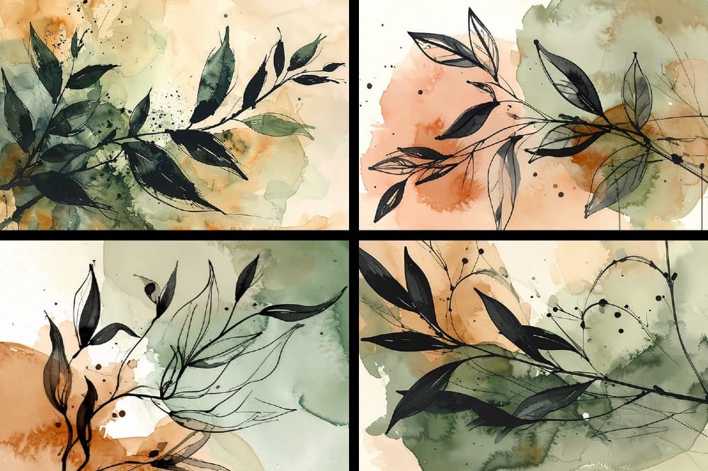 Ink Garden is a collection of expressive ai-generated botanical abstract background papers inspired by loose ink drawings and flowing natural forms. Each design combines delicate hand-drawn leaves and stems with soft watercolor washes, creating a calm composition of organic lines, gentle movement, and layered artistic texture.