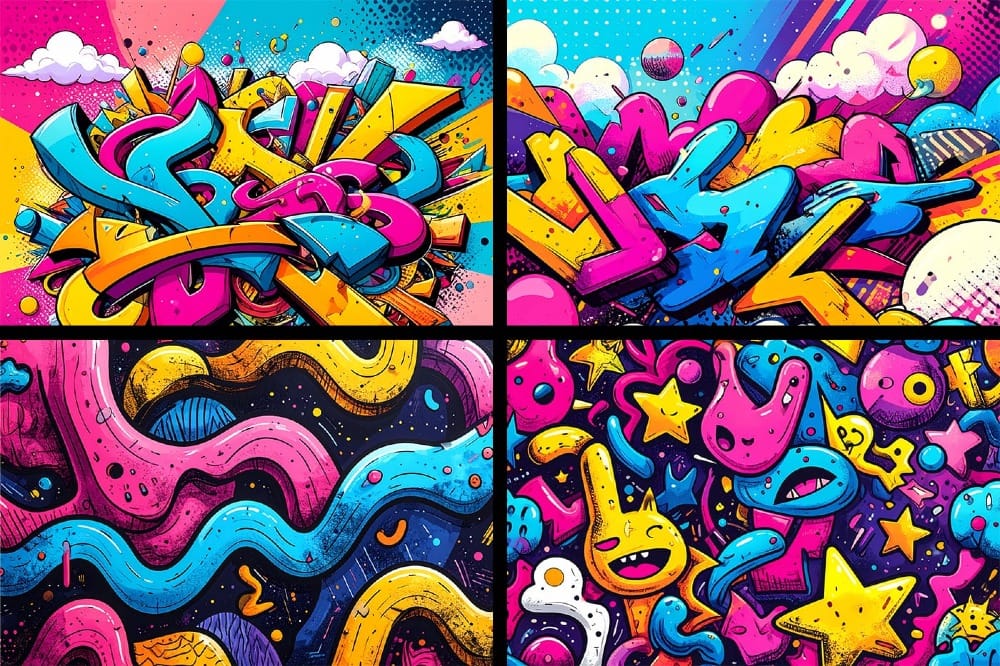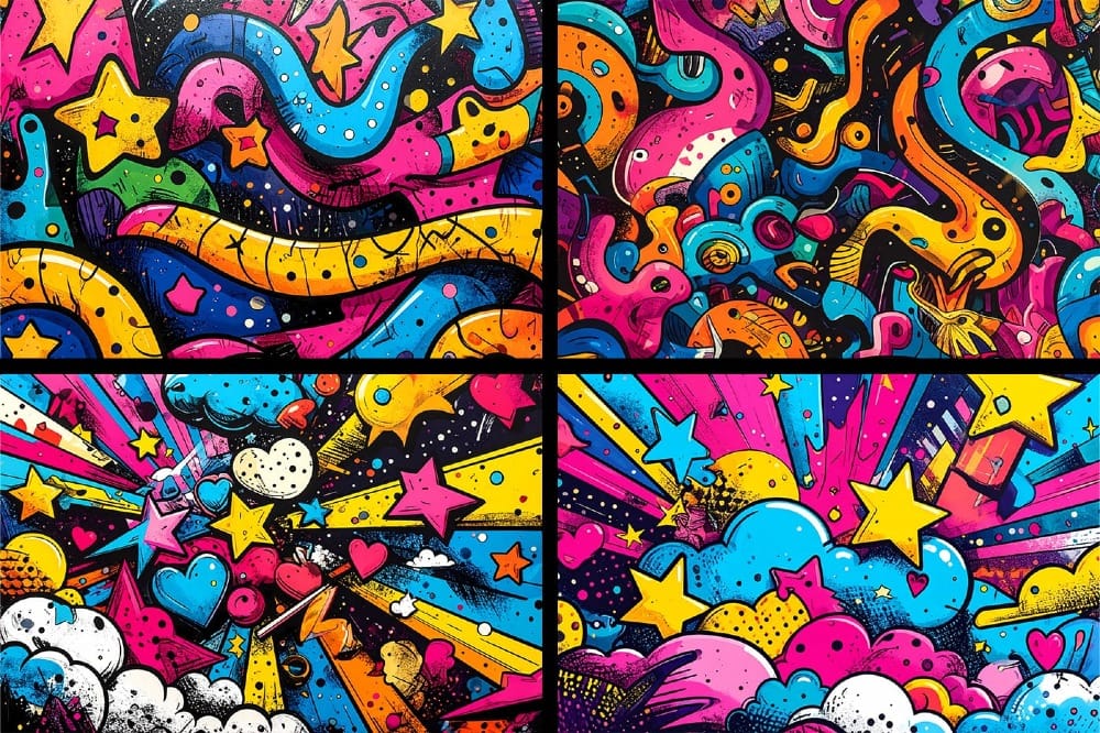 These pop art graffiti backgrounds are perfect for urban branding, streetwear graphics, poster design, album covers, DJ flyers, event promotions, sneaker mockups, skateboard graphics, packaging design, YouTube thumbnails, social media posts, website headers, digital ads, print-on-demand products, phone cases, laptop skins, and bold contemporary art prints.
