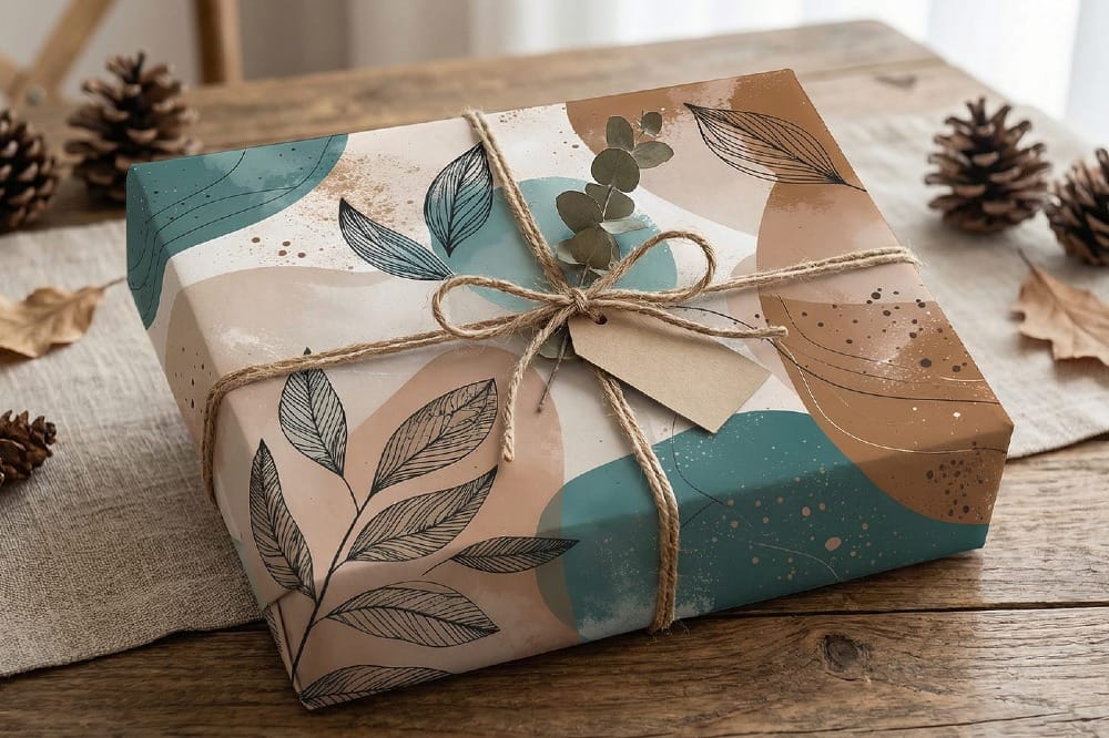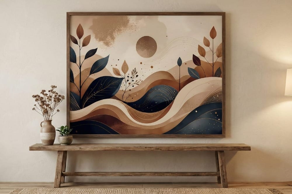 The muted earthy palette of clay, sand, cream, deep brown, and soft teal creates a soothing atmosphere, while fine botanical line work adds structure and refinement. The textured surfaces feel artistic and layered without becoming heavy or distressed, keeping the overall look balanced and timeless.