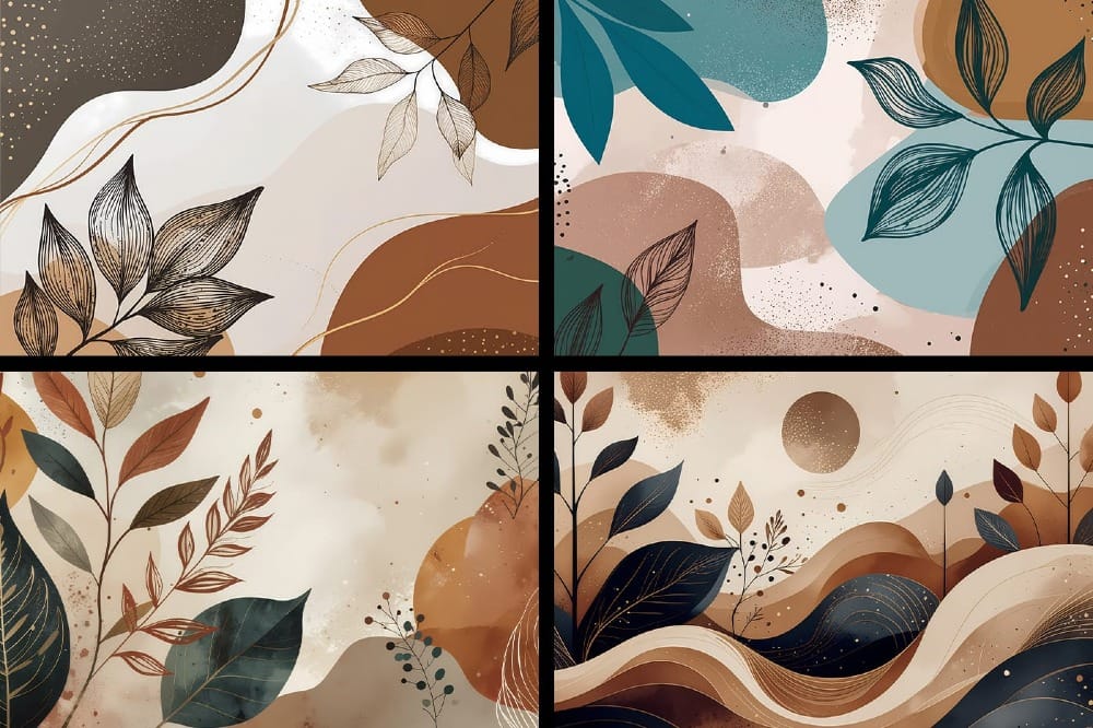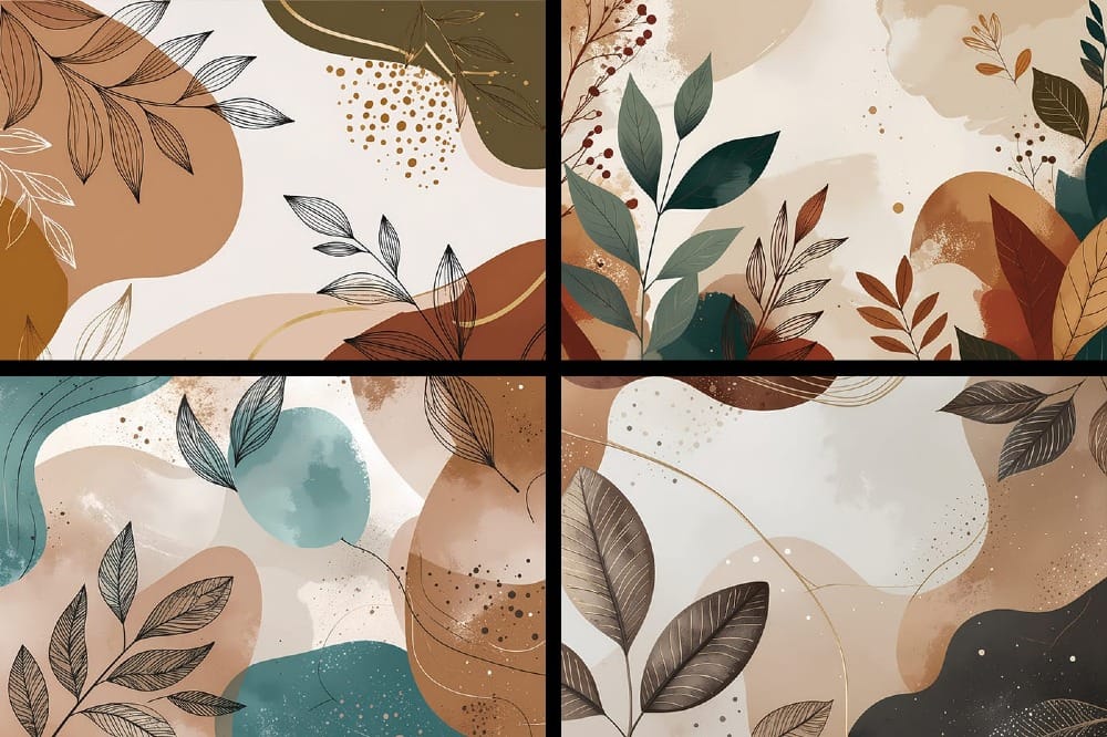 Quiet Garden is a collection of warm, textured botanical abstract, ai-generated, Free background papers inspired by calm natural forms and modern decorative design. Each piece blends simplified leaf illustrations with soft organic shapes, layered paint washes, delicate speckles, and subtle line details that give the artwork depth and elegance.