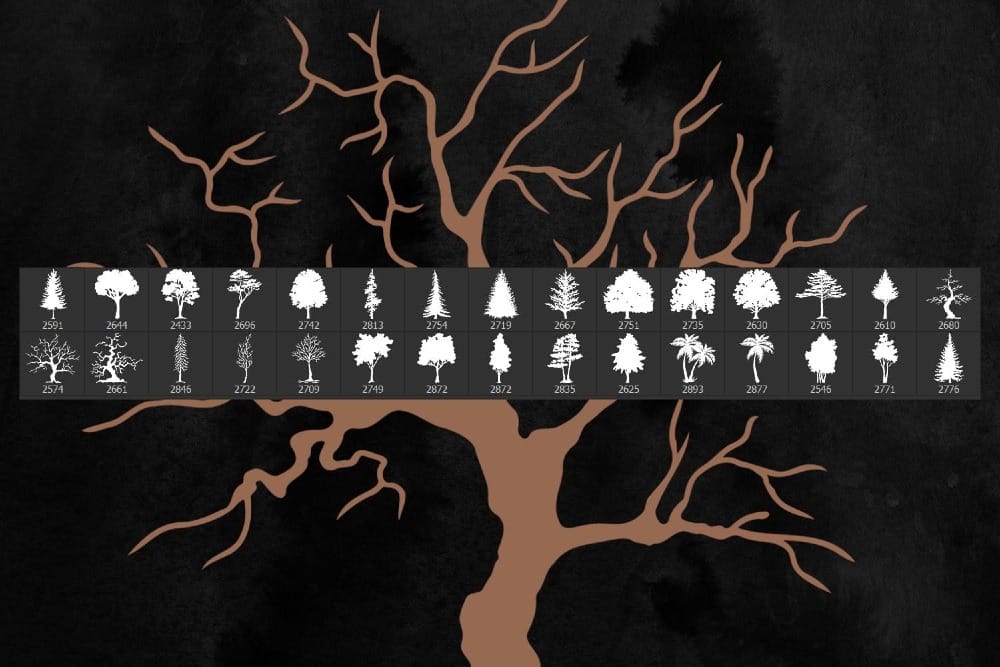 The Trees Photoshop Stamp Brushes set includes 30 high-resolution tree stamps designed to help you add natural elements to your artwork quickly. These brushes work well for building scenes, backgrounds, or decorative details without having to draw trees from scratch.