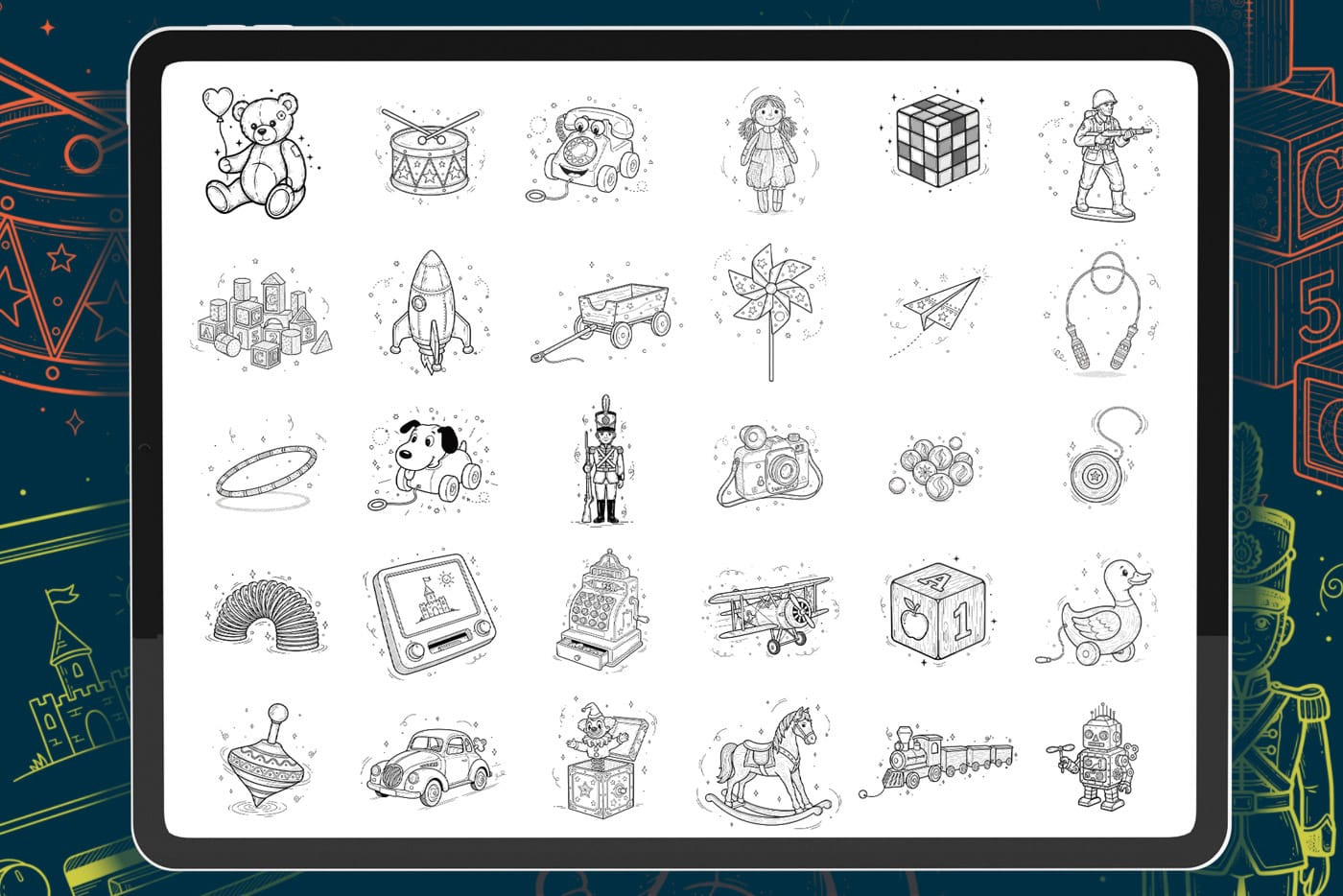 Vintage Toyland – 30 Classic Vintage Toys Photoshop Brushes invites you to add a playful touch of nostalgia to your digital designs. The free download gives you immediate access to 30 high-resolution Photoshop stamp brushes that capture the charm of toy trains, rocking horses, teddy bears, spinning tops and more. With these, you can easily bring retro warmth and childhood memories into your artwork, scrapbook pages or branding projects.